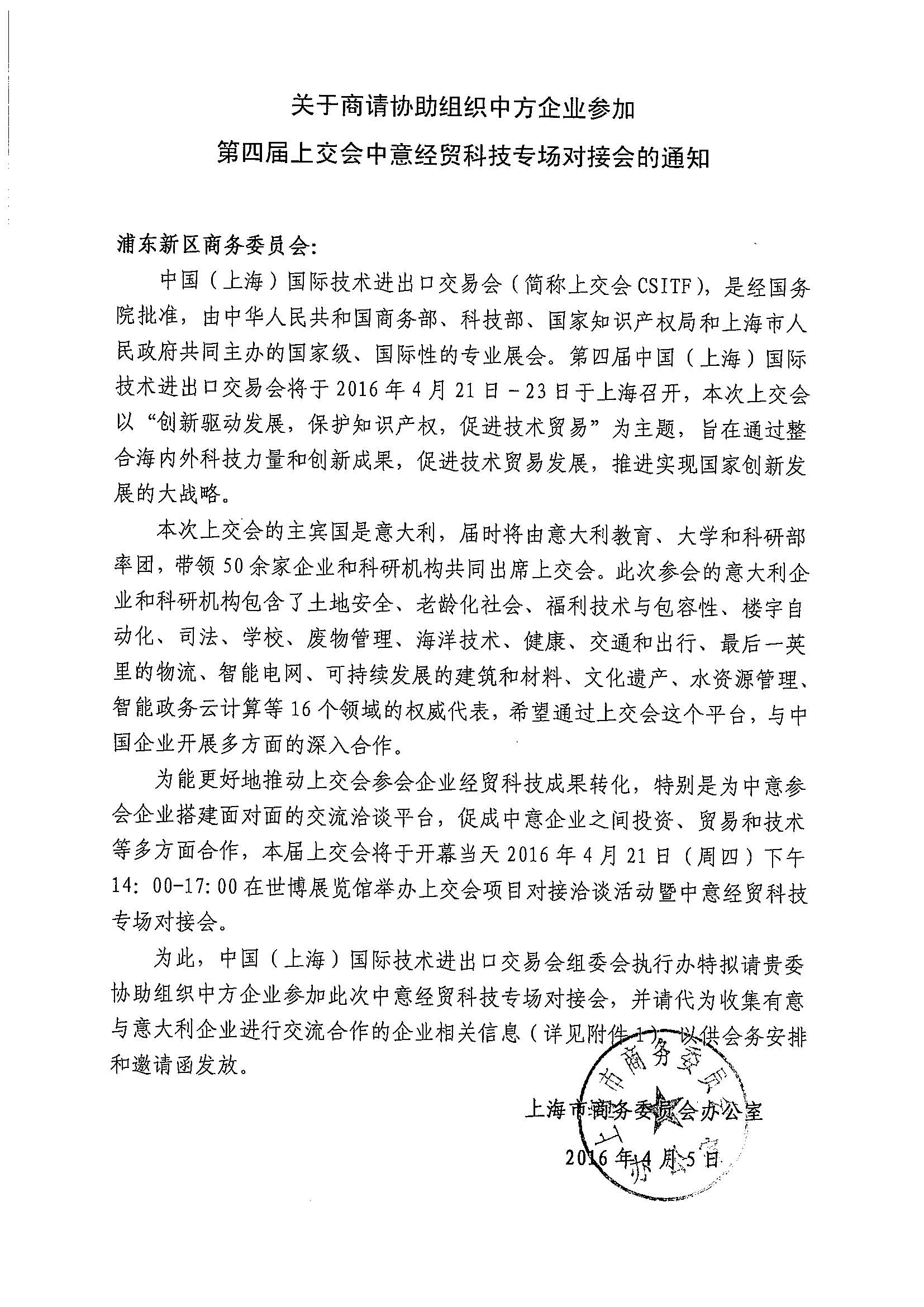 关于组织企业参加第四届上交会中意经贸科技专场对接会的通知